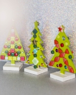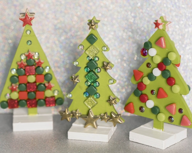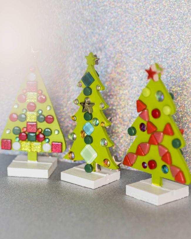 Trois petits sapins en bois se parent de mosaïque aux reflets rouges, verts et dorés, comme si les lutins eux-mêmes y avaient cousu leurs souvenirs de fête.