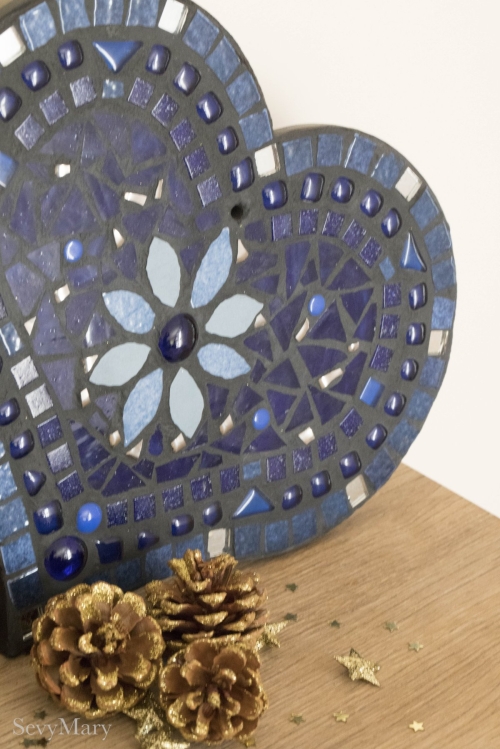 Ce cœur en mosaïque bleu profond invite au calme et à l’expression sincère.