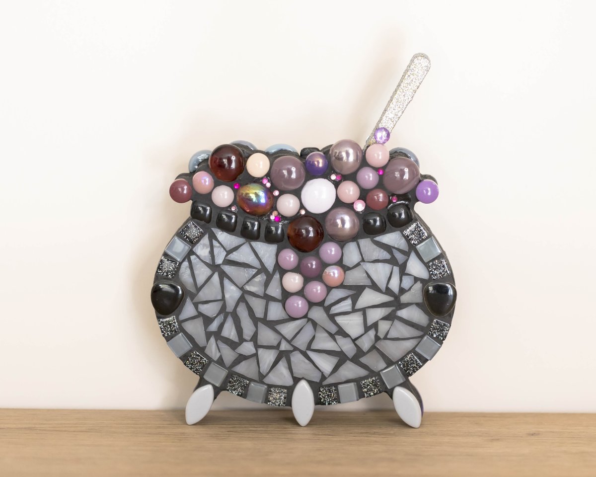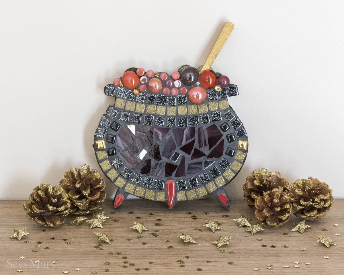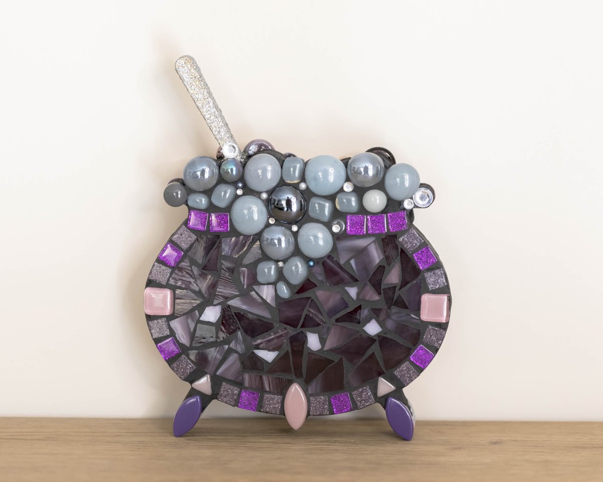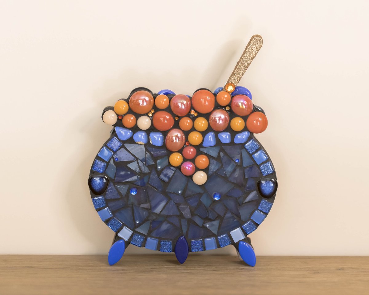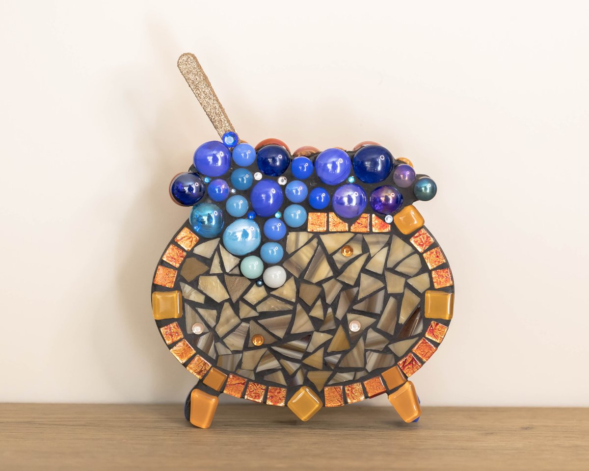 Petits chaudrons doubles, enchâssés de mosaïque recto/verso, nés pour contenir l’insaisissable : un sort, un rêve, un feu secret. Chaque pièce est unique, composée de céramiques, verres, émaux de Briare, cabochons et autres fragments d’univers. Ils évoquent l’alchimie du cœur, la cuisine des émotions, les potions invisibles qui rendent la vie plus étrange et plus belle.